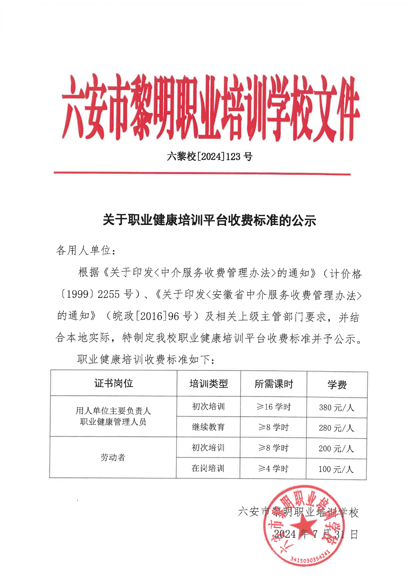 职业健康培训收费公示